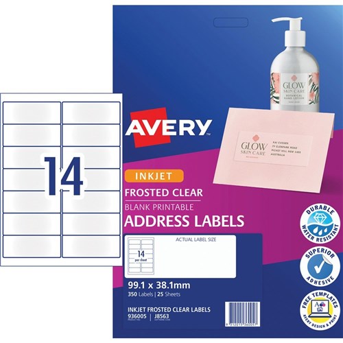 AVERY CLEAR INKJET LABELS J8563 14 L/P/Sht 99.1x38.1mm Address PK25 FROSTED CLEAR