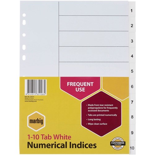 MARBIG POLYPROPYLENE INDICES - NUMERICAL 1-10 A4 White SET