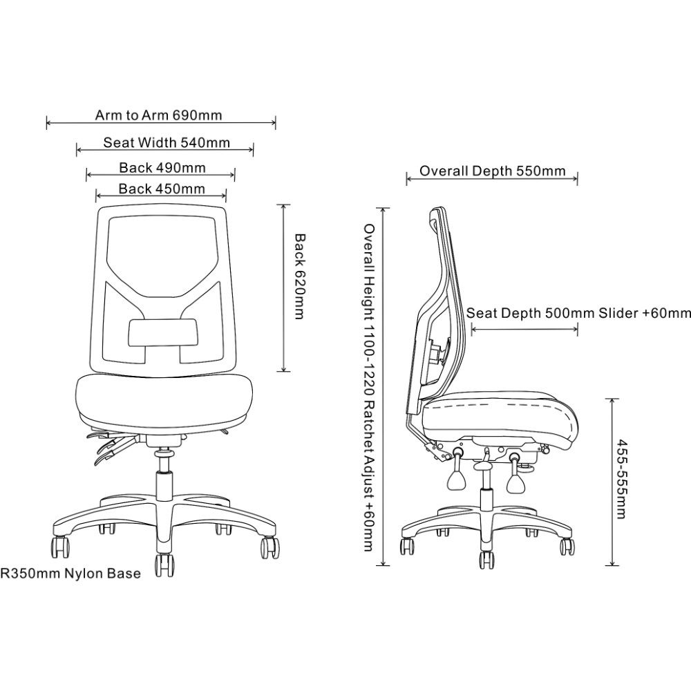 • Seat Width: 540mm. Seat Depth: 500-560mm. Back Height: 620mm. Back Width: 450-490mm. Seat Height Floor To Seat: 455-555mm.