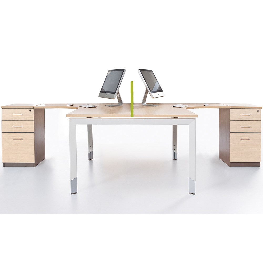 • 2 Person Corner Workstation Snow Maple top and White frame. Includes 2 x 2 drawer 1 file fixed pedestals.