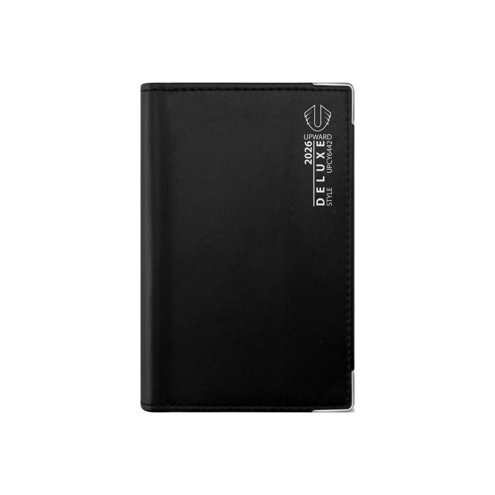• Ribbon marker. Tabs, Lay flat opening. Translucent pocket.