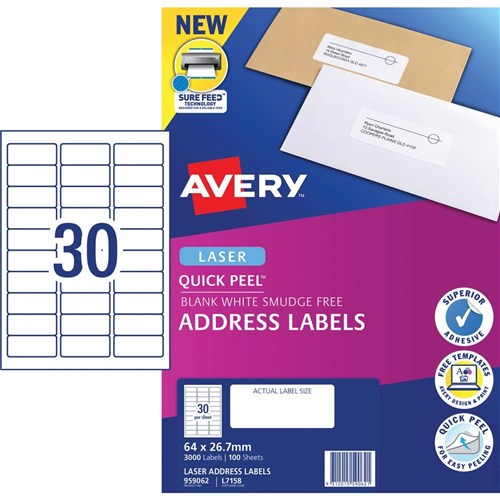AVERY ADDRESS LASER LABELS L7158 30UP 64x26.7mm BX100