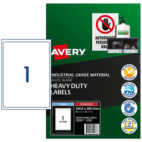 AVERY HEAVY DUTY LASER LABELS L7067 1UP 199.6x289.1mm PK25