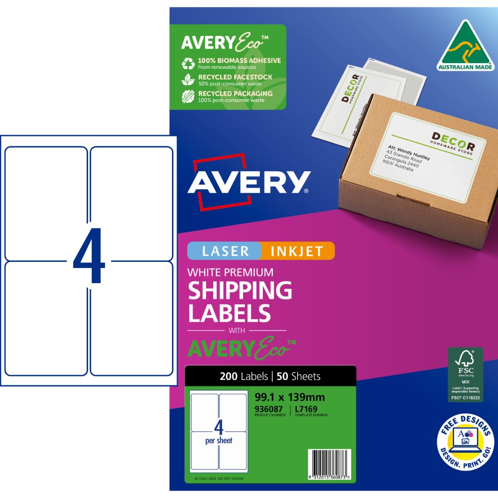 Avery Premium Shipping Labels White Laser Inkjet AveryEco L7169 99.1x139mm 4UP 200 Lab