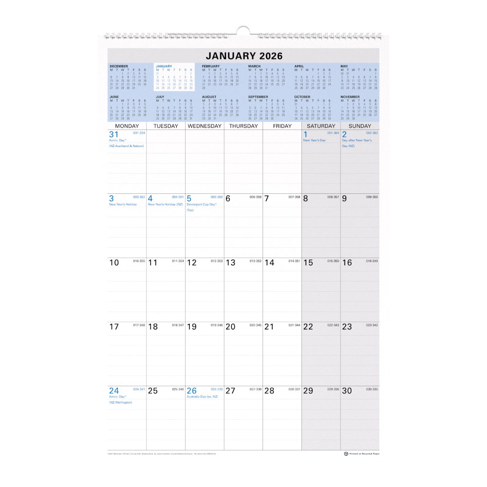 • Features: Australian and New Zealand Holidays Julian Days (Calendar Only) Shaded Saturday and Sunday.