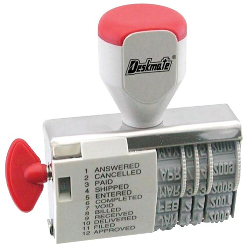 • Rubber date stamp with 4 bands + phrase band (12 phrases).