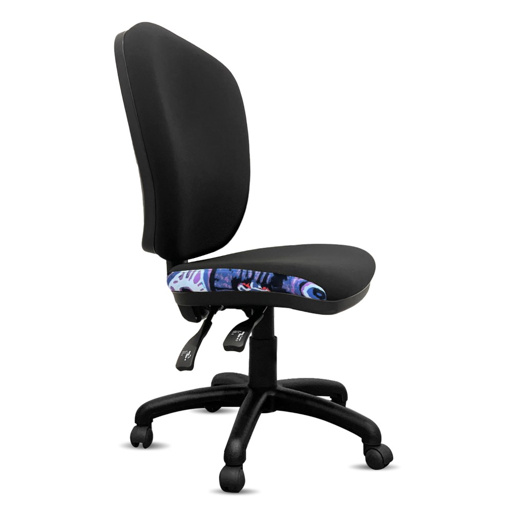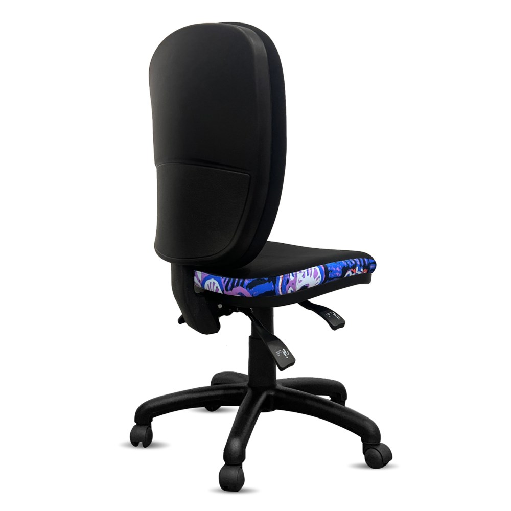 • A unique commercial fabrics designed by Murdie Nampijinpa Morris (Indigenous Artist) combined with K2 Black Fabric to upholster the chair.