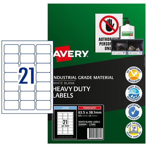 • Size: 63.5x38.1mm 525 labels, 25 sheets. 21 labels per sheet (21UP).
