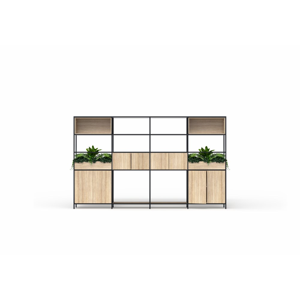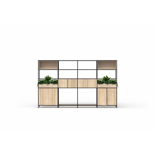 • OLG Rhodes Modular Shelving 4 Bay 3360W x 455D x 2000mmH New Oak Ravine Black Frame