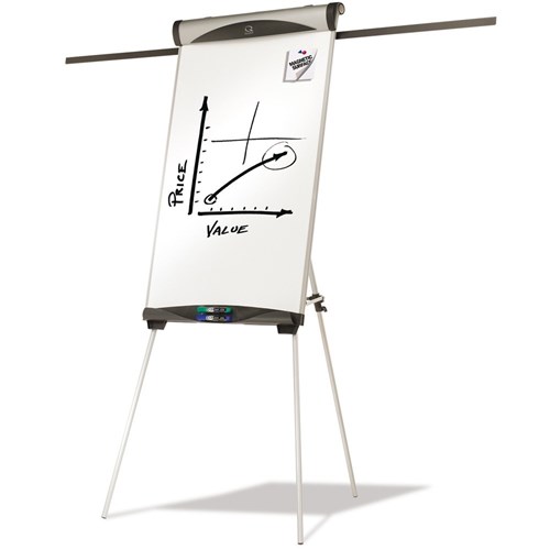• Magnetic whiteboard easel with tripod base and telescoping legs.