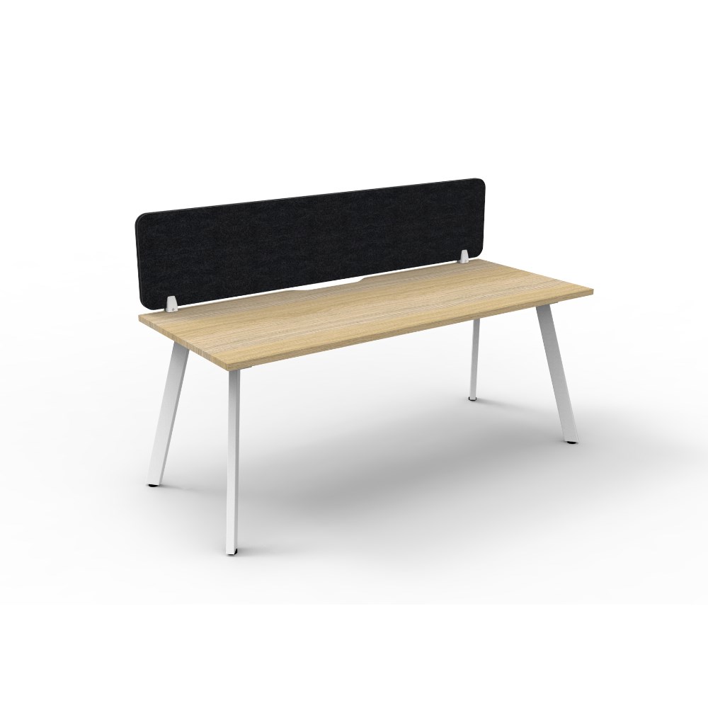• Natural Oak worksurface with rigid edging and 410mmW x 50mmD scallop cable access. White Satin powder coat frame. Eco screen.