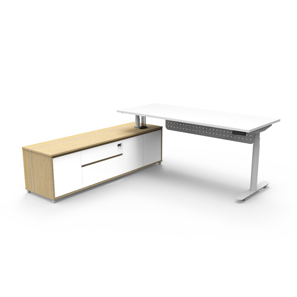 • Natural White top and White Satin frame. Height adjustable desk with modesty panel and left hand side cabinet.