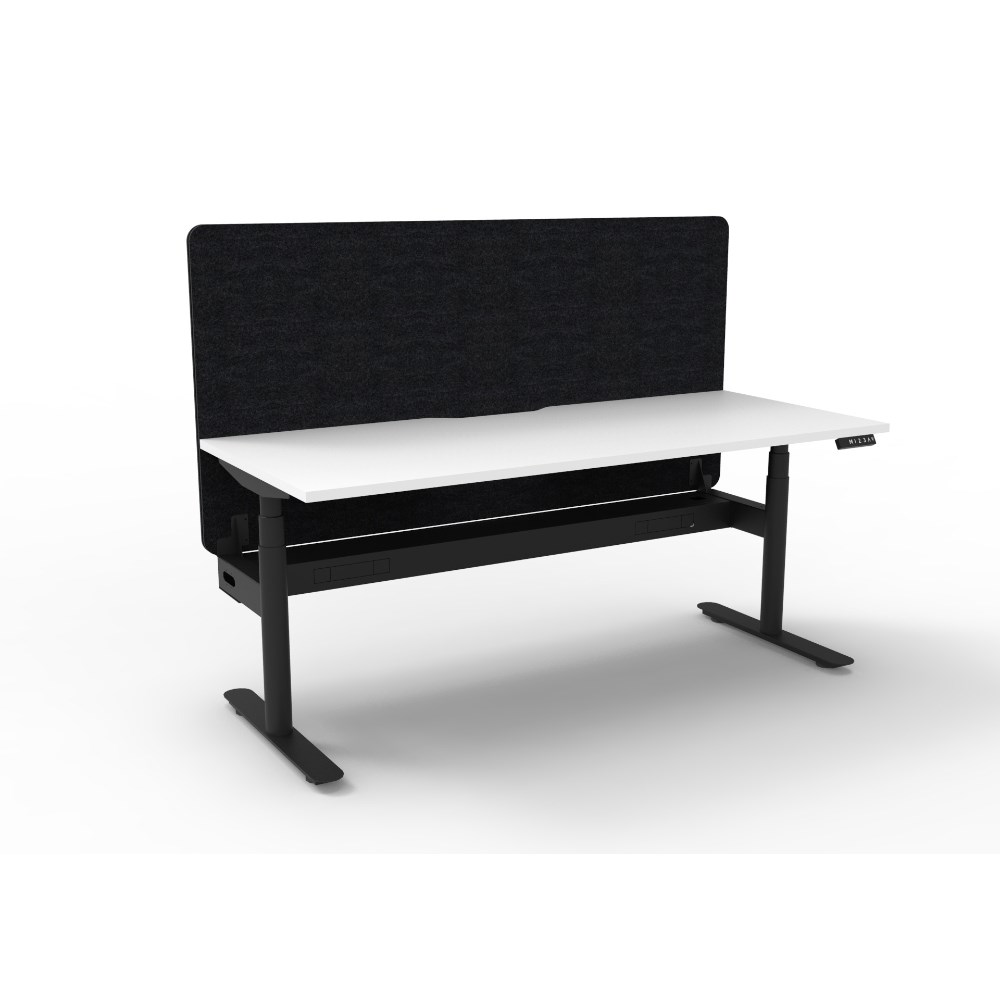 • Natural White worksurface with rigid edging and 50mm scallop cable cut out. E0 rated 25mm top. Black Satin powder coat round-leg frame. Eco screen and cable tray.