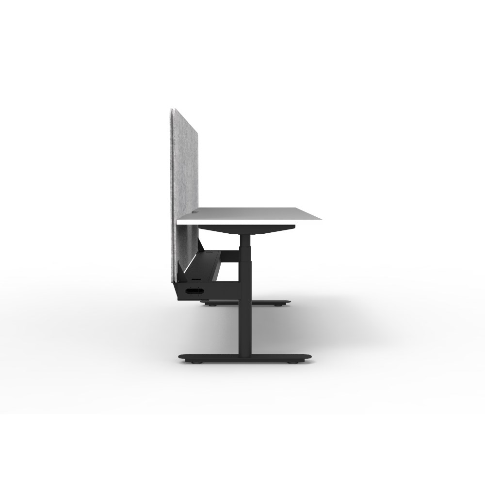 • Natural White worksurface with rigid edging and 50mm scallop cable cut out. E0 rated 25mm top. Black Satin powder coat round-leg frame. Eco screen and cable tray.