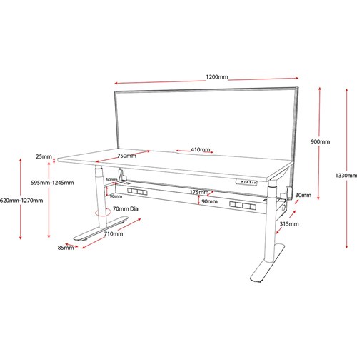 • 70mm diameter round column legs. 700mm wide foot size with adjustable leveling feet, return foot: 700mm. Comes with 30mm thick privacy screens and cable tray for cable management.