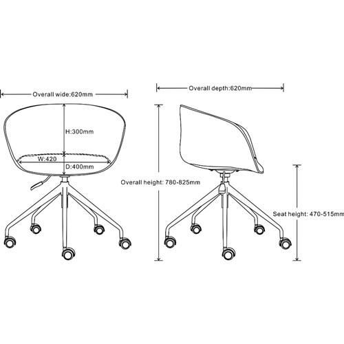 • Seat Width: 420mm. Seat Depth: 400mm. Back Height: 300mm. Seat Height Floor to Seat: 470-515mm.