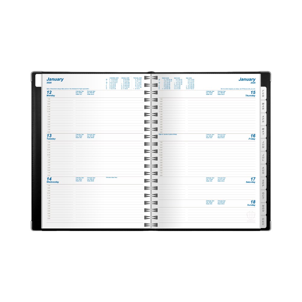 • Double wire binding. Lay flat opening. Ribbon marker. Tabs. Translucent pocket.