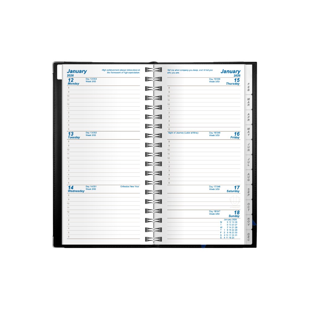• Ribbon marker. Tabs, Lay flat opening. Translucent pocket.