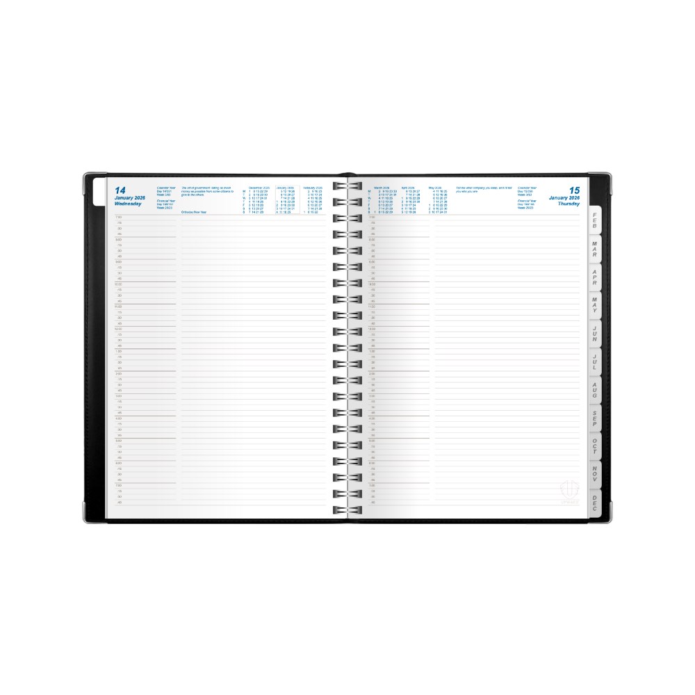 • Double wire binding. Lay flat opening. Ribbon marker. Tabs. Translucent pocket.